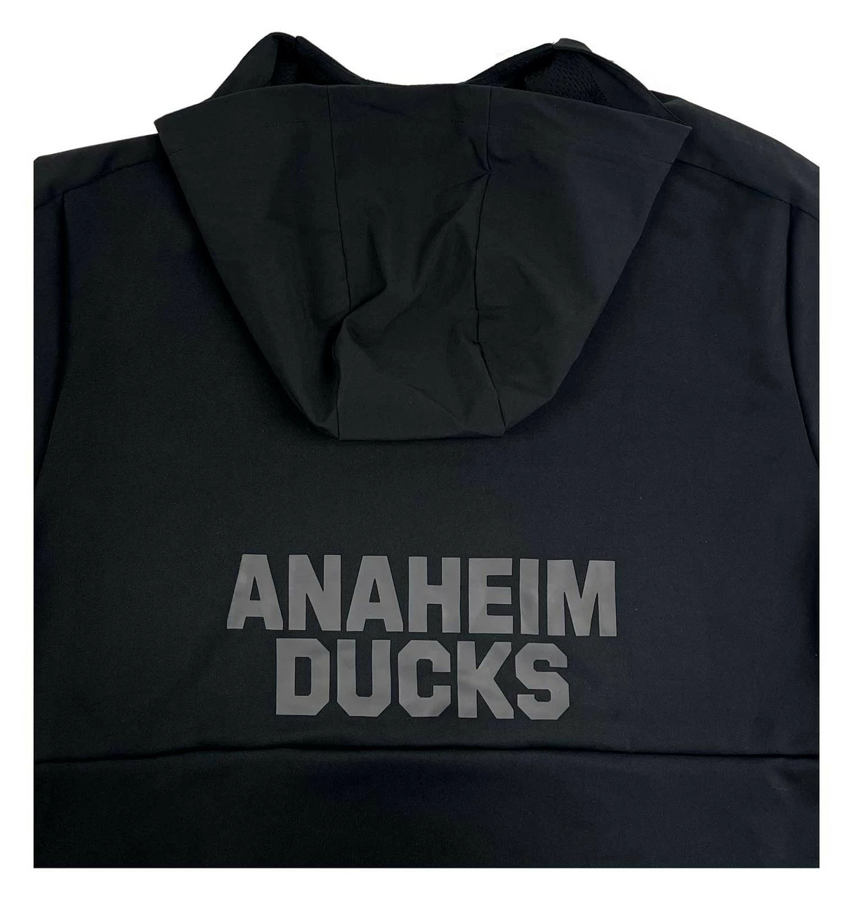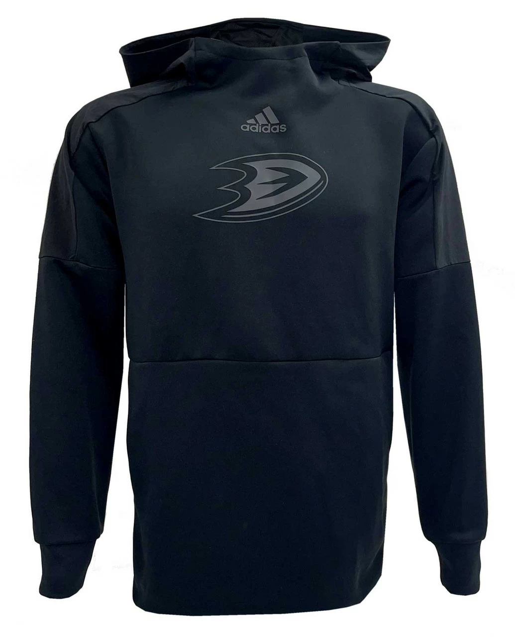 Adidas Men’s Anaheim Ducks NHL Hockey Hooded Sweatshirt. Represent California hockey like the loyal fan you are. Gaiter neck long-sleeve hooded sweatshirt with 2 front zipper pockets to keep your phone and wallet safe. Tone on tone screen-print logo across the front. Anaheim Ducks tone on tone screenprint across the lower waist back. Lightweight soft feel, Shell 100% polyester, Insert 87% Polyester, 13% Spandex. Officially licensed by the NHL. Color: Black/Black. Ducks3