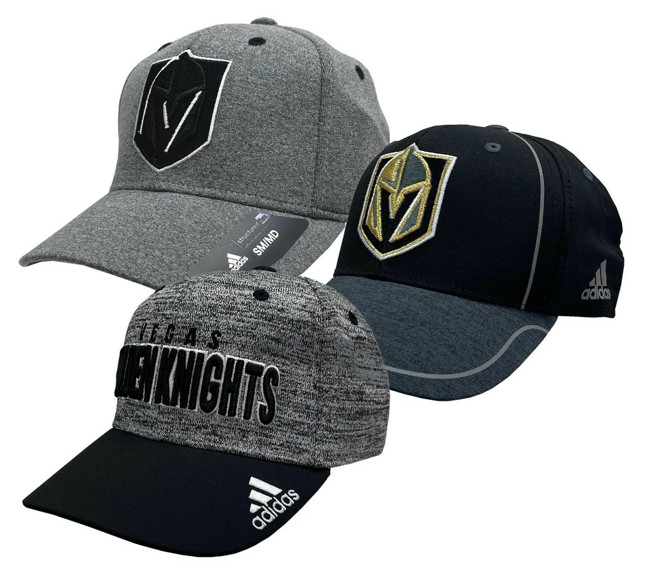 Adidas Las Vegas Knights NHL Hockey (3 Pack) Stretch Flex Fit Baseball Cap size S/M. Even if your training session gets hot, your style can be cool. This Adidas hat hits all the angles. Featuring a Pre-curved brim, six-panel construction and made with durable 97% Polyester, 3% Spandex. Knights5