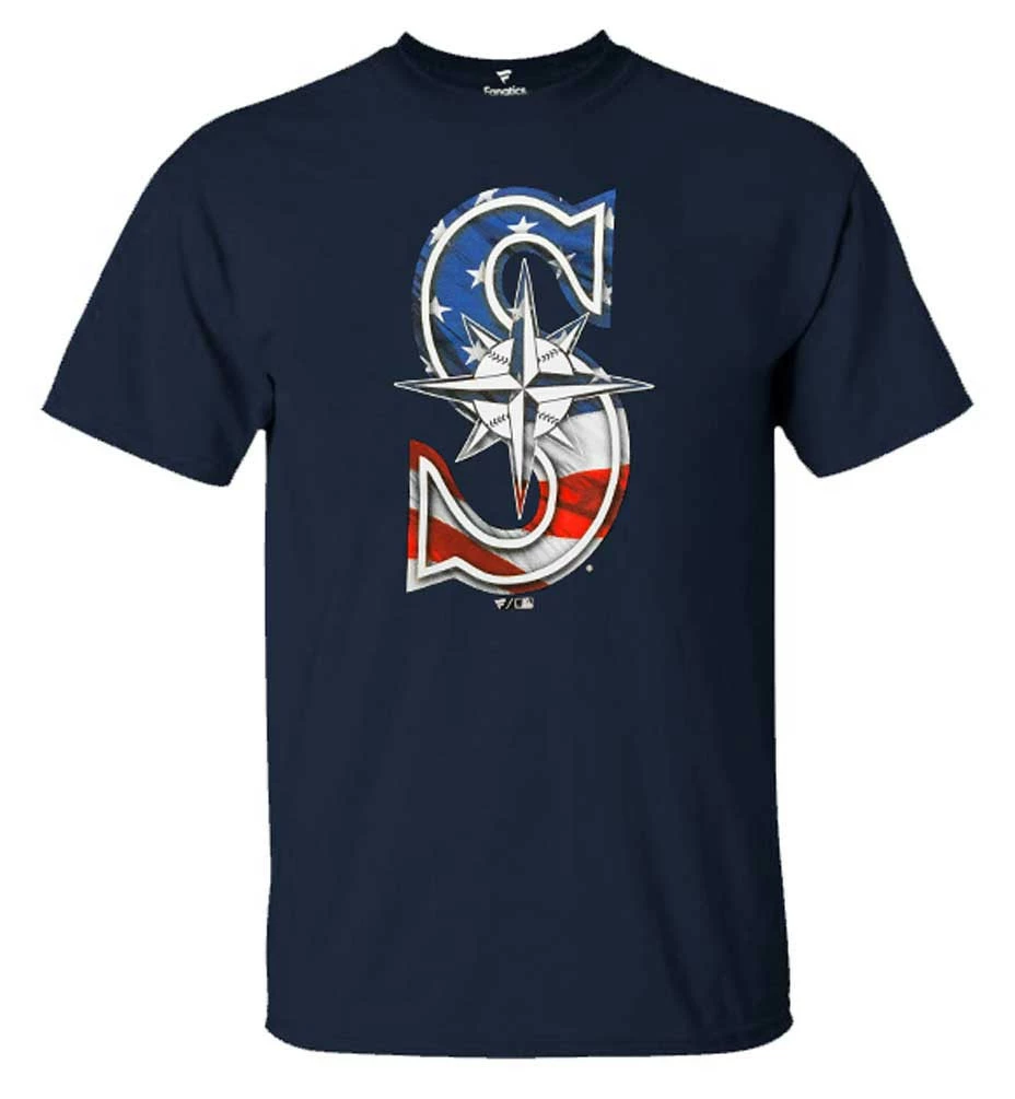 Time to get ready for the Seattle Mariners season with this Short Sleeve BannerWave tee from Fanatics. Add this soft and comfortable short sleeve t-shirt to your collection and you’ll always be ready to support your Seattle Mariners. Large Patriotic Flag Banner Team Logo across the front. Fanatics brand tee made of 100% Preshrunk Cotton. Officially Licensed by MLB. Color: Navy. QF6E-4506-MVR-5A7