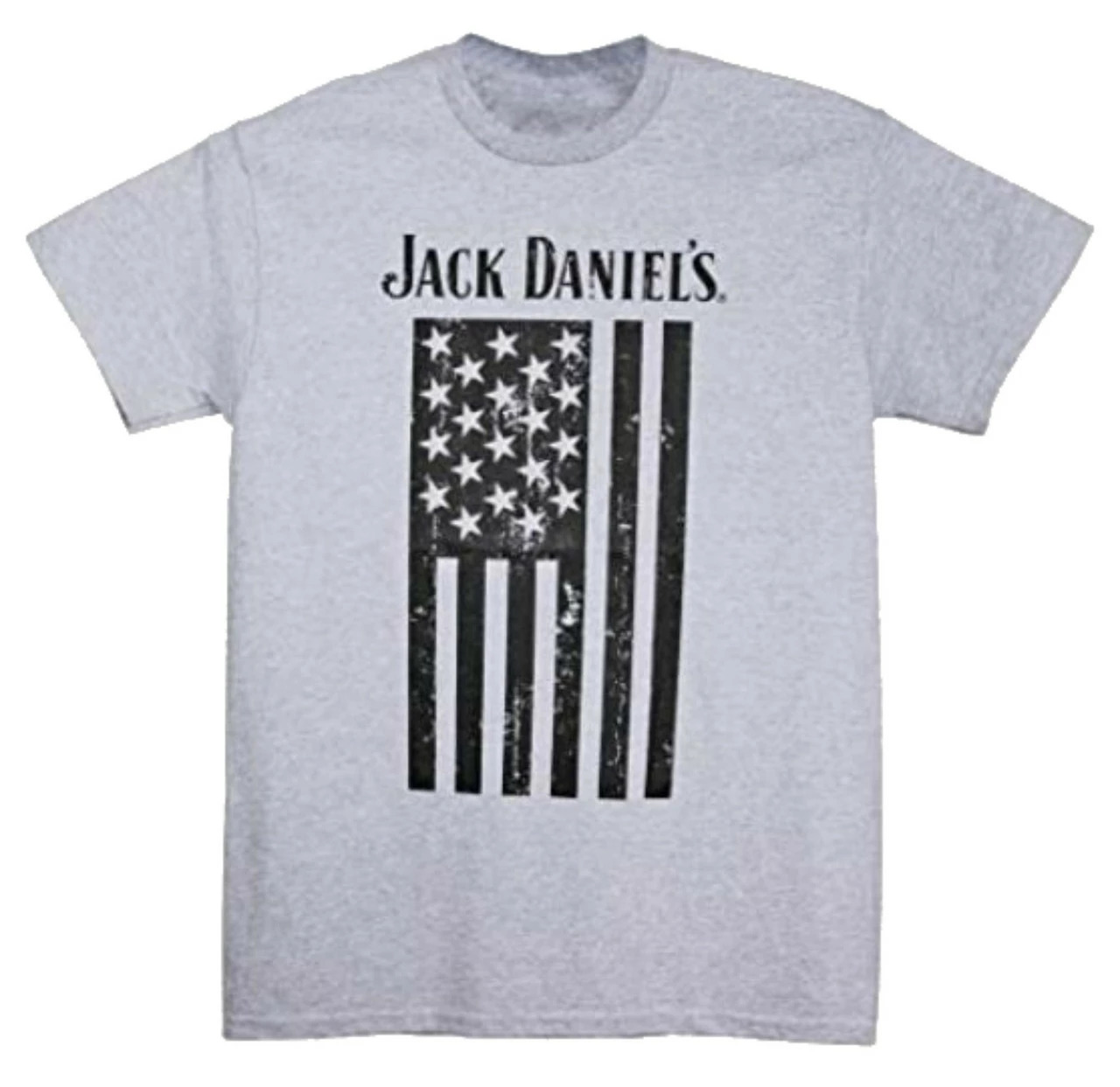 Jack Daniel’s No.7 Fine Old Whiskey Worn Logo Crew Neck T-Shirt – Gray, 15261489JD-79. Officially licensed Jack Daniel’s Monochrome American Flag T-Shirt. This grey “Jack Daniel’s” t-shirt is made from cotton and features a “Jack Daniel’s” Monochrome American Flag design on the front. Made from 90% cotton, 10% polyester