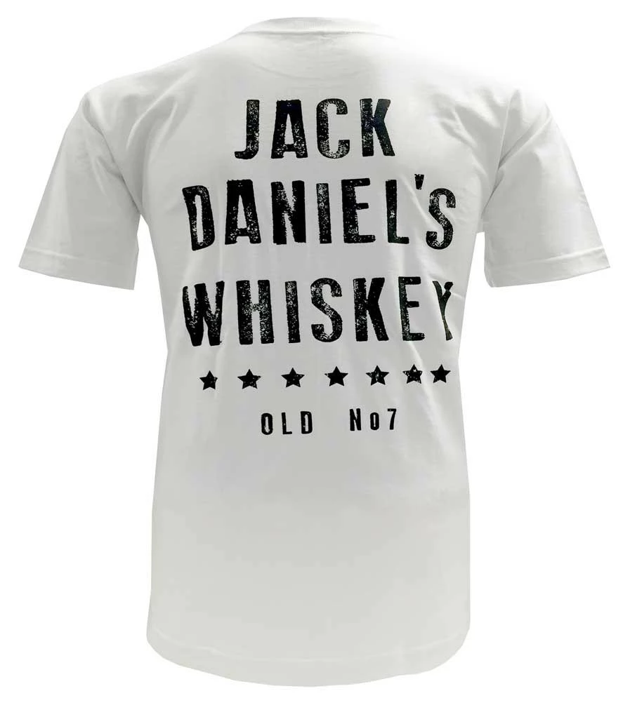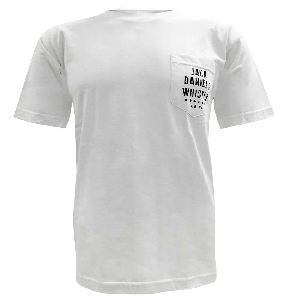 Jack Daniels Mens White Pocket Cotton T-Shirt Tee, White/Black. 15261466JD-01. Casual and comfy Tees are perfect anyday! This Men’s white short sleeve pocket tee with Jack Daniel’s Whiskey logo on back. The perfect way to display your pride of Jack Daniel’s Tennessee Whiskey! Classic Jack Daniel’s Made In USA Short Sleeve Shirt. Traditional T-shirt neckline and cut. Front chest pocket. Jack Daniels Whiskey Old #7 graphic on the back. 100% cotton, Machine wash cold, Tumble dry low, Do not iron on print. Color: White and black. 15261466JD-01