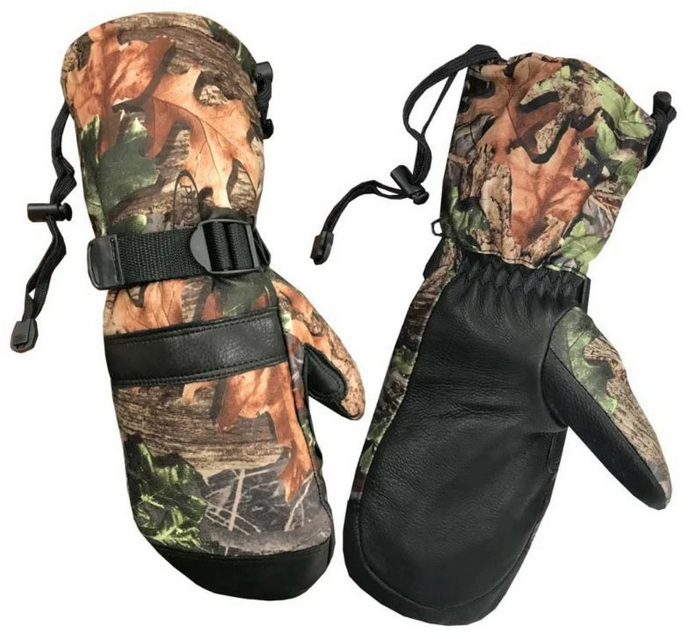 Northstar Cold Weather Hunting Mitton Features Full Grain Elkskin Leather palm and 150 Gram 3M PlatinumThinsulate lined technology. 150 Gram Thinsulate Lined? Insulation 3M traps and holds body heat. Won’t absorb water. Also features Ski-Dri? technology which makes the mitten Waterproof, Breathable and Windproof. Open mitten, no Finger slots in lining. Recommended for cold weather activity levels where wearer generates/builds a lot of body heat through activity or cool conditions. Toggle wrist straps. Color: Black/Green Camo. 63CA