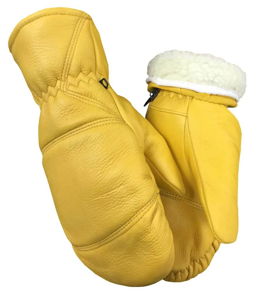 Northstar Unisex Grain Deerskin Removeable Sherpa Liner Chopper Mitten, Tan/Yellow. 53T. U.S. family owned business since 1977 whose mission is to provide top quality products to companies and individuals & provide a service to the trapper and hide collectors by paying them fair market value and receiving prompt payment for their goods. Rugged and durable are the two common words associated with our industry leading work gloves. Genuine Grain Deerskin Mitten Tan (Lined). Genuine grain deerskin leather. Flexible thumb design. Warm White Sherpa Lining. Leather cuff hem and shirred elastic wrist. Color: Tan/Yellow. 53T