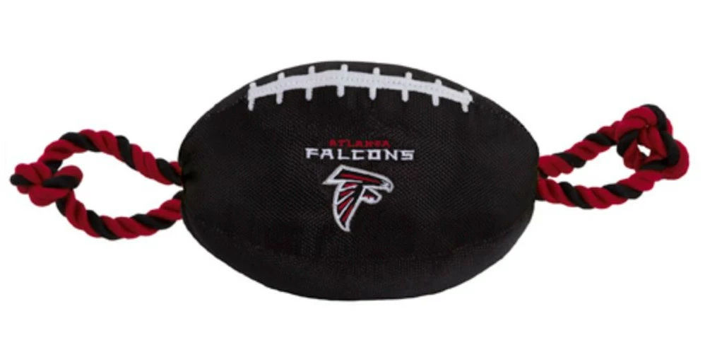 Pets First Atlanta Falcons Nylon Football Dog Toy – Black & Red, ATL-3121. Officially licensed NFL pet toy. Built for tug, fetch & general fun! Constructed from heavy-duty nylon material with poly-fill. Internal squeaker and team colored rope on both ends. Team logo embroidered on front. The strong rope is great for a game of tug, while the inner squeaker keeps your dog entertained! Size: 12″ L x 4″ W.