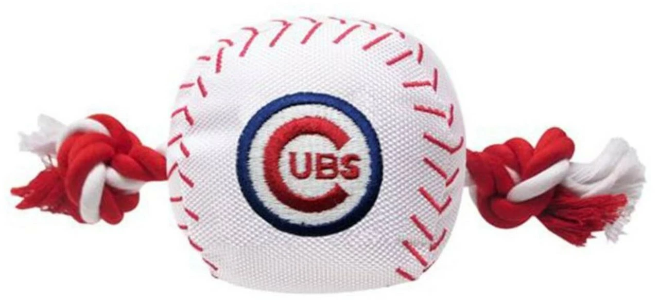 Pets First Chicago Cubs Nylon Baseball With Squeaker Rope Toy for Dogs, White and Red, CUB-3105. Built for tug, fetch & general fun! This MLB Nylon Baseball Rope Toy is made with 100% smooth heavy duty nylon. Baseball Toy is poly filled and has an embroidered Cubs team logo. Contains a built-in squeaker and a pull rope giving you hours of fun with your four-legged slugger. Red whip stitching gives it an authentic baseball look. Size: 9″ L x 4″ W x 4″ H.
