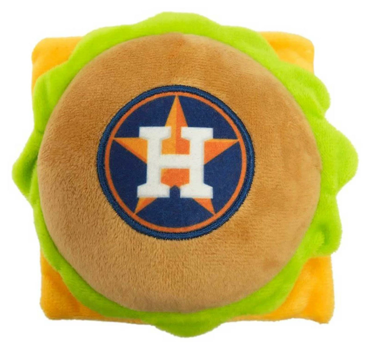 Pets First Houston Astros Plush Hamburger Toy, AST-3353. Get your furry friend ready for gameday! Your furry four-legged friends can enjoy the same stadium concessions that you do! Each toy features a color team logo and is poly-filled with an internal squeaker. This officially licensed toy will provide hours of fun. Size: 5″ x 3″.