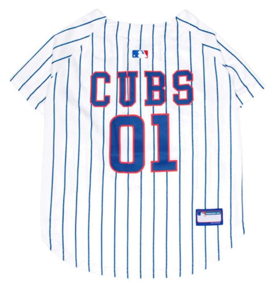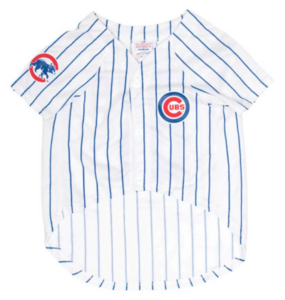 Pets First Chicago Cubs Baseball Dog Jersey – White & Blue, CUB-4006. Officially licensed MLB pet jersey. Made from durable polyester fabric designed for your pets comfort. Back has screen printed team logo and woven label. Front has screen printed MLB team logo. Classic baseball pinstripe jersey. Perfect for watching baseball with your four-legged friend. Individual fit may vary. Size chart is a suggested size guide only.