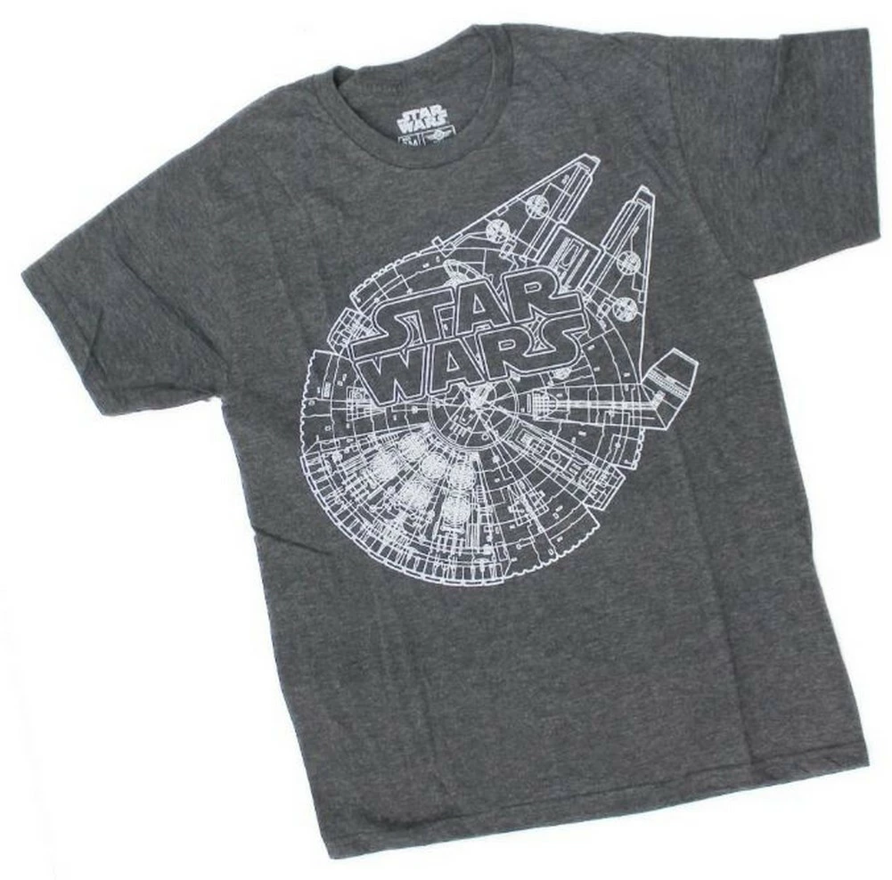 Enjoy everything about the Star Wars Millennium Falcon inside and out with this tee! This design is officially licensed by Star Wars and features the design details of the best ship in the galaxy. Material: 50% Cotton, 50% Polyester. Officially licensed tee. Color: Charcoal/White. SWSRBJFMSC