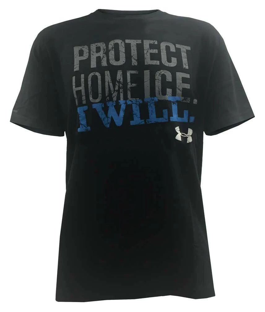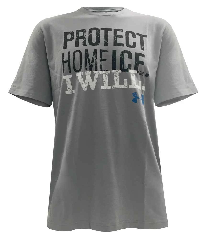 Under Armour Men’s Protect Home Ice Short Sleeve Tee T-Shirt, 1276982. This fresh and bold Hockey tee easily gets you recognized as a Hockey Soul. Distressed “Protect Home Ice, I Will” graphic across the front in contrasting colors. Features HeatGear? – a sweat-wicking fabric to keep you cool, dry and light. This UA Tech? fabric is quick-drying, ultra-soft & has a more natural feel then most shirts. technology remedys the growth of odor causing substances. Made from 3.9 oz. Polyester. 1276982