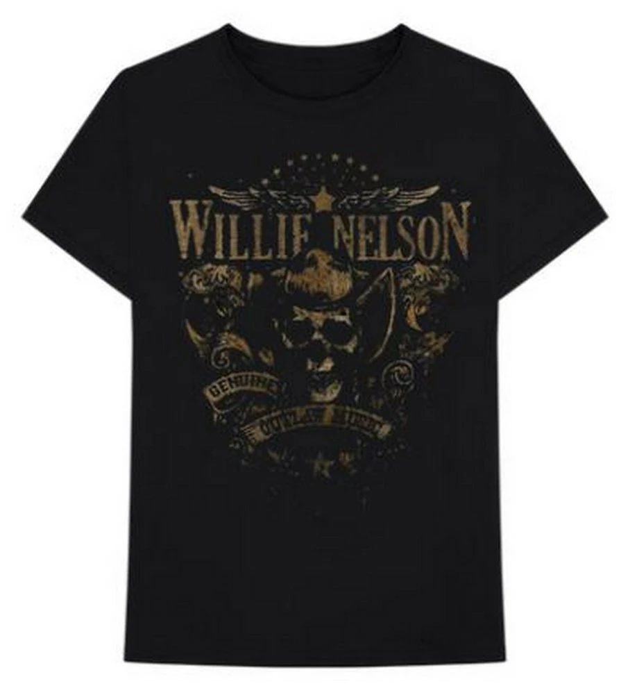 Is Mr. Willie Nelson your Jam? Make sure everyone knows with this fashionable tee. Soft lightly distressed Graphic on black. Genuine Outlaw Music with Skull graphic. Blank back. Officially licensed. Material: 100% Cotton. Color: Black/Tans. ZRWN1009