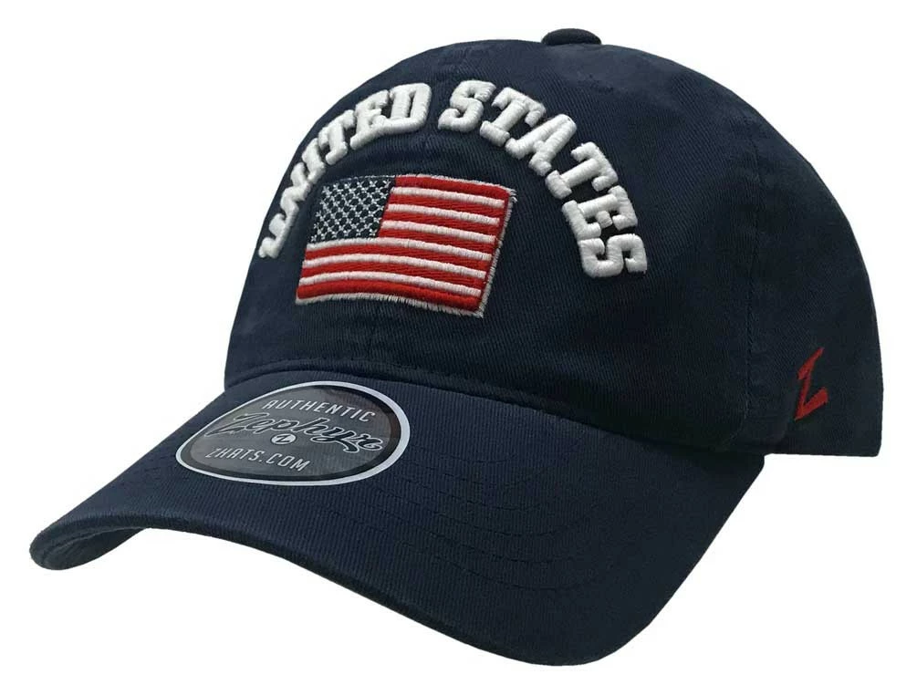 Zephyr created this comfort worn prewashed low profile cap with a patriotic look and feel. Cap is unstructured for a perfect, comfortable fit. The cap features a navy backdrop for the large embroidered “United States” and USA Flag patch on the front. 6 Solid Panels on this unstructured relaxed fit cap. Comfortable adjustable cloth slide strap on the back. One Size Fits Most. Interior sweatband for added comfort, 100% Cotton. Color: Navy/White/Red. USAWDN0020